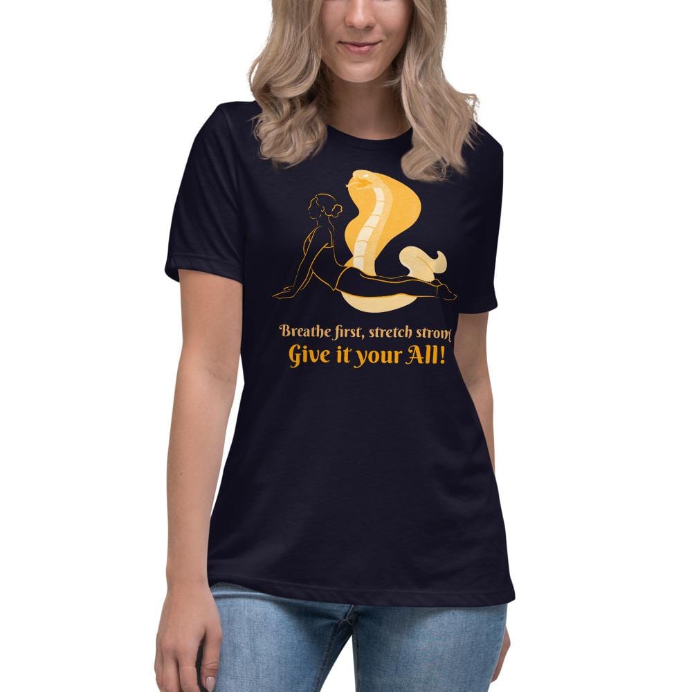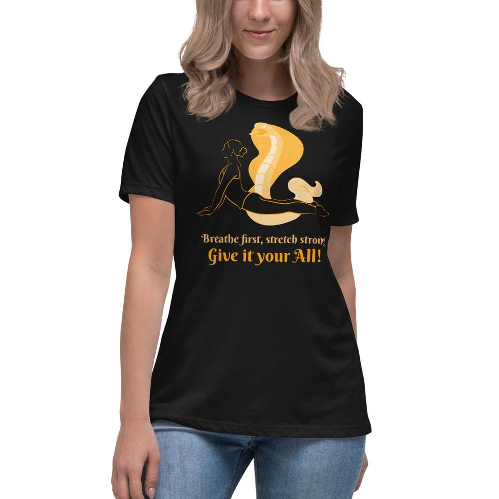Breathe First, Stretch Strong Give it your all t-shirt is inspired by mental health. This t-shirt is high quality and just might be the softest and most comfortable women's t-shirt you'll ever own. Combine the relaxed fit and smooth fabric of this tee with jeans to create an effortless every-day outfit, or dress it up with a jacket and dress pants for a business casual look.