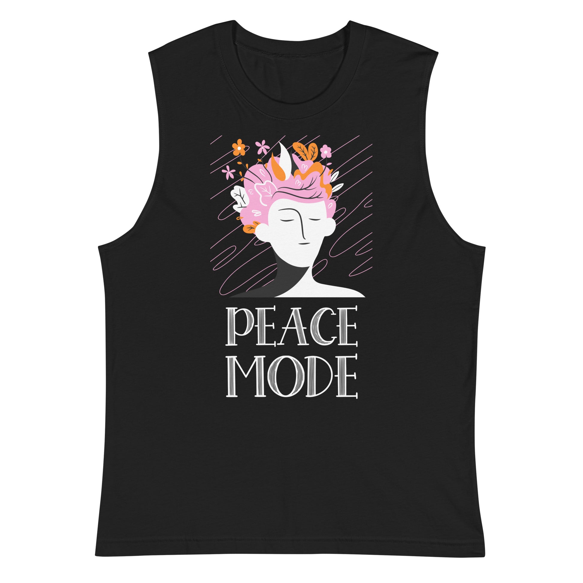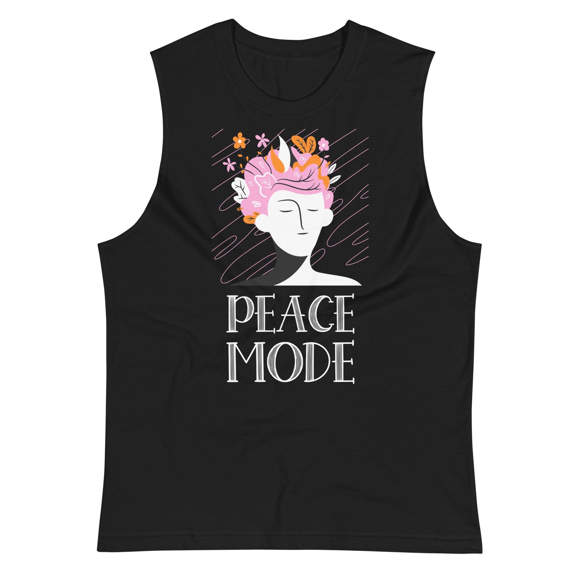 Peace Mode Unisex Muscle Shirt inspired by mental health. This soft, sleeveless tank is so comfy you're going to want to wear it everywhere, be it on your couch, out on a walk, or during a yoga class. The relaxed fit and low-cut armholes gives it a casual, urban look. Wear Conscious clothing. Clothing with purpose.